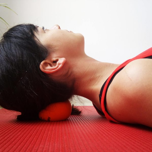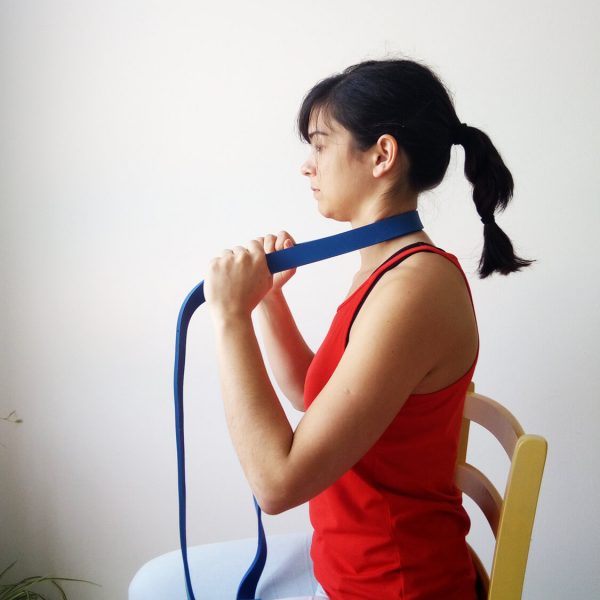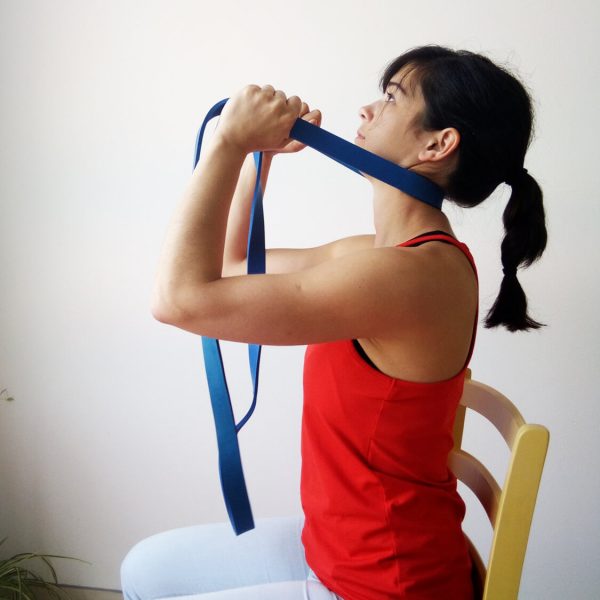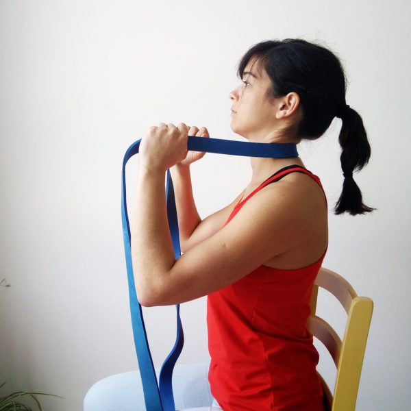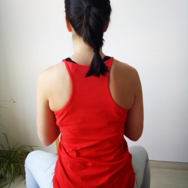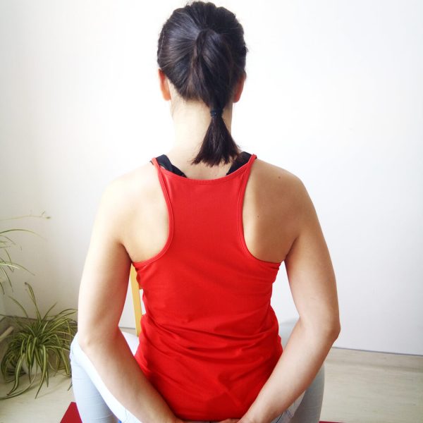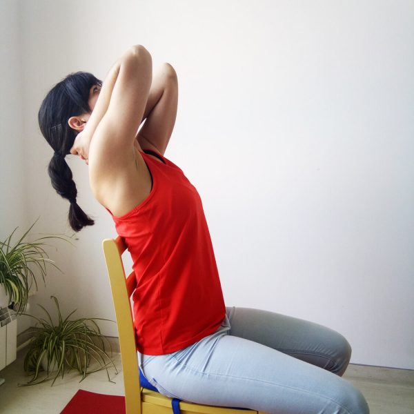 Udobno se usedite z vzravnanim trupom in postavite obe roki za hrbet. Medtem ko naredite globok in dolg vdih, z rokama potiskajte v smeri proti tlom in ob izdihu sprostite.