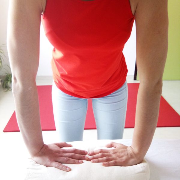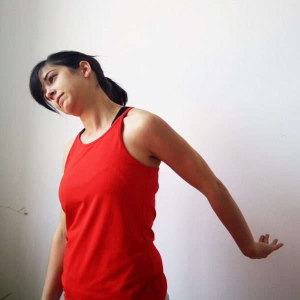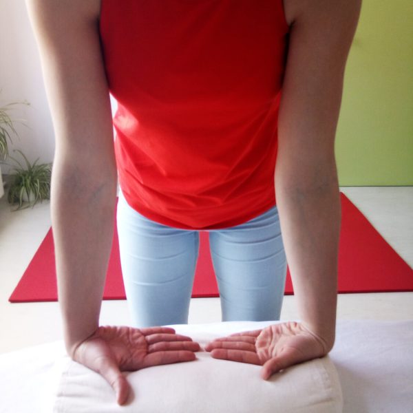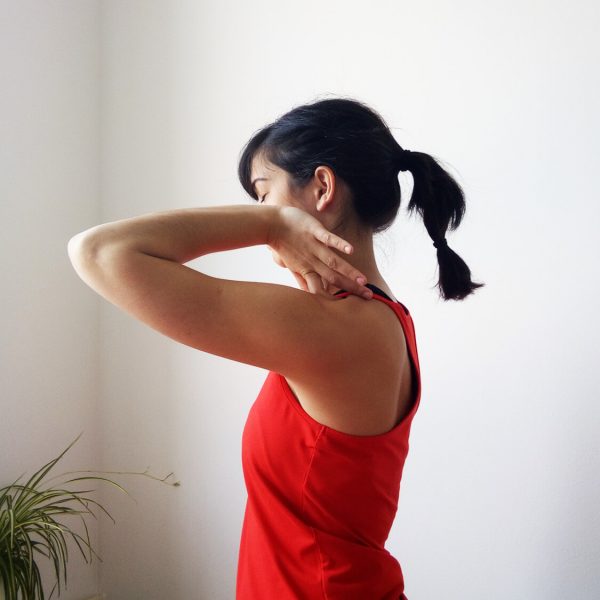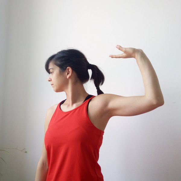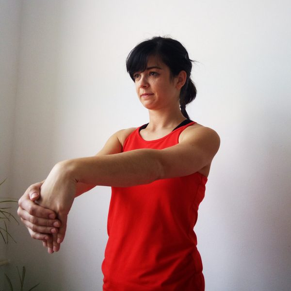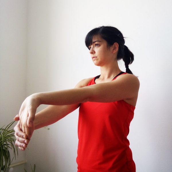 Iztegnite roko predse tako, da je dlan obrnjena proti tlom. Z drugo roko primite za prste in jih povlecite navzdol, tako da občutite napetost zunanje strani podlakti. Zadržite 15 sekund in nato ponovite še na nasprotni strani.