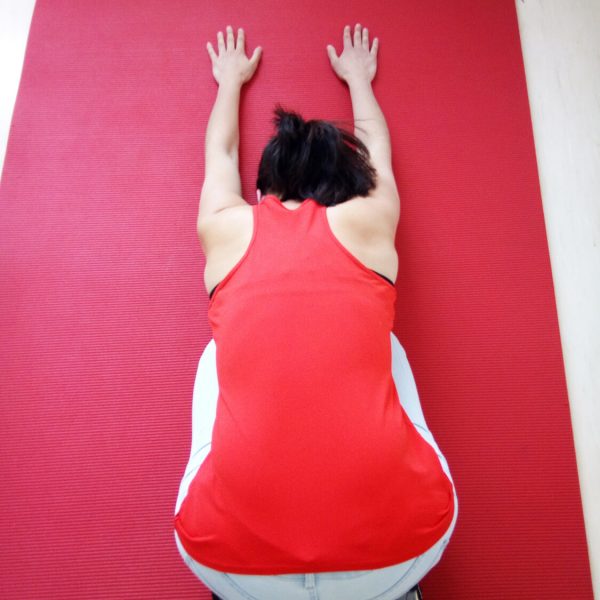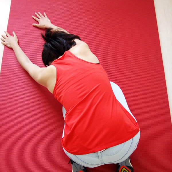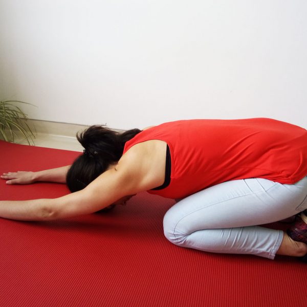 Kleče na kolenih in zadnjico, ki počiva na petah (lahko si jo podložite z blazino), se usločite in spustite čim bližje tlom. Občutite razteg spodnjega dela hrbta ter se po 20 sekundah pomaknite najprej na eno stran, po 20 sekundah pa še na drugo stran. Na ta način si zagotovite sprostitev obeh strani hrbtnih mišic.