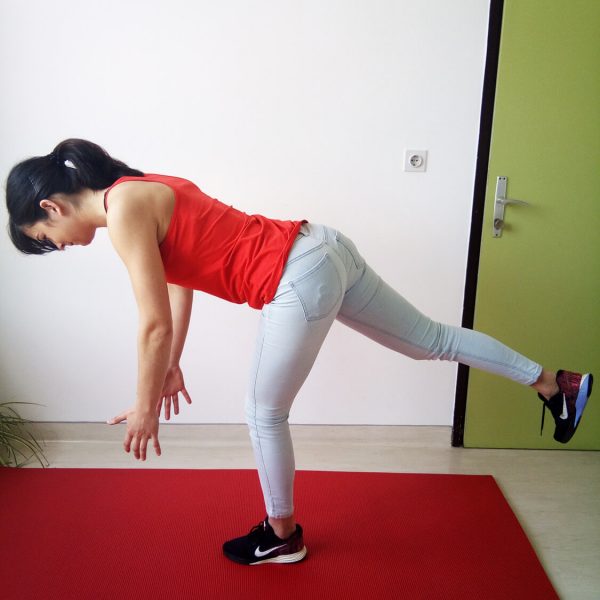 Stojte na eni nogi in se z ravnim trupom začnite nagibati naprej, medtem ko istočasno iztegujete “nihajno” nogo. Spustite se do višine, ki vam jo dovoljuje gibljivost hrbta in kolkov, moč nog in pa ravnotežje. Najpomembneje je, da si pri dvigu v začetni položaj pomagate z močno aktivacijo zadnjičnih mišic in mišic nog ter se izogibate, da bi usločili hrbet nazaj.