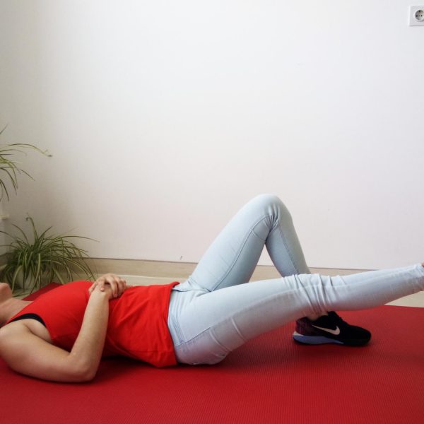 Leže na hrbtu, postavite stopalo na nasprotno koleno in z rokama povlecite spodnjo nogo k trupu (kot na sliki). V tem položaju je pomembno občutiti razteg mišic zadnjičnega predela, medtem ko zgornji del trupa, ramena in rama počivajo na tleh. Vztrajajte v položaju vsaj 20 sekund in nato zamenjajte nogi.