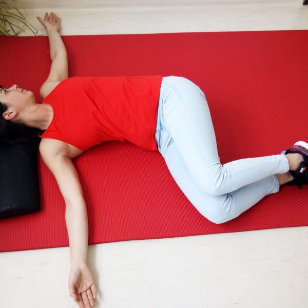 Ležite vzravnano na bok, podprite glavo z blazino in pokrčite obe koleni in stegni do pravega kota. Iz tega položaja, z zgornjo roko potujte na nasprotno stran (“narišite mavrico”), medtem ko glava in prsni koš sledita gibanju roke. Na enak način se vrnete v začetni položaj.